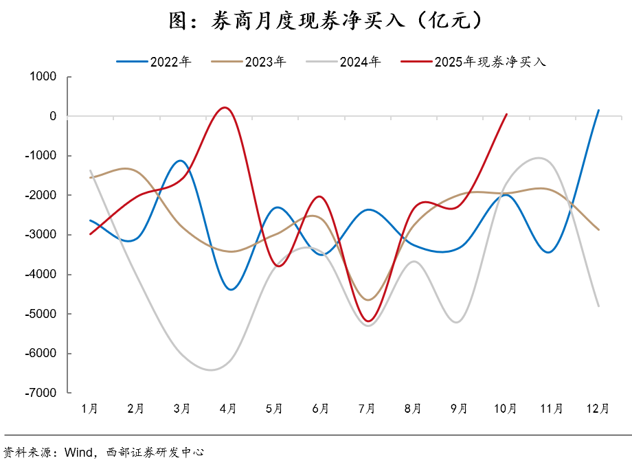 2025年随着债市多次调整,券商自营整体减持债券,其中5月、7月减持规模较大,从品种来看,地方政府债、同业存单、非金信用债减持较多,2025年9月相较于2024年末分别减持1536亿元、1470亿元、323亿元。