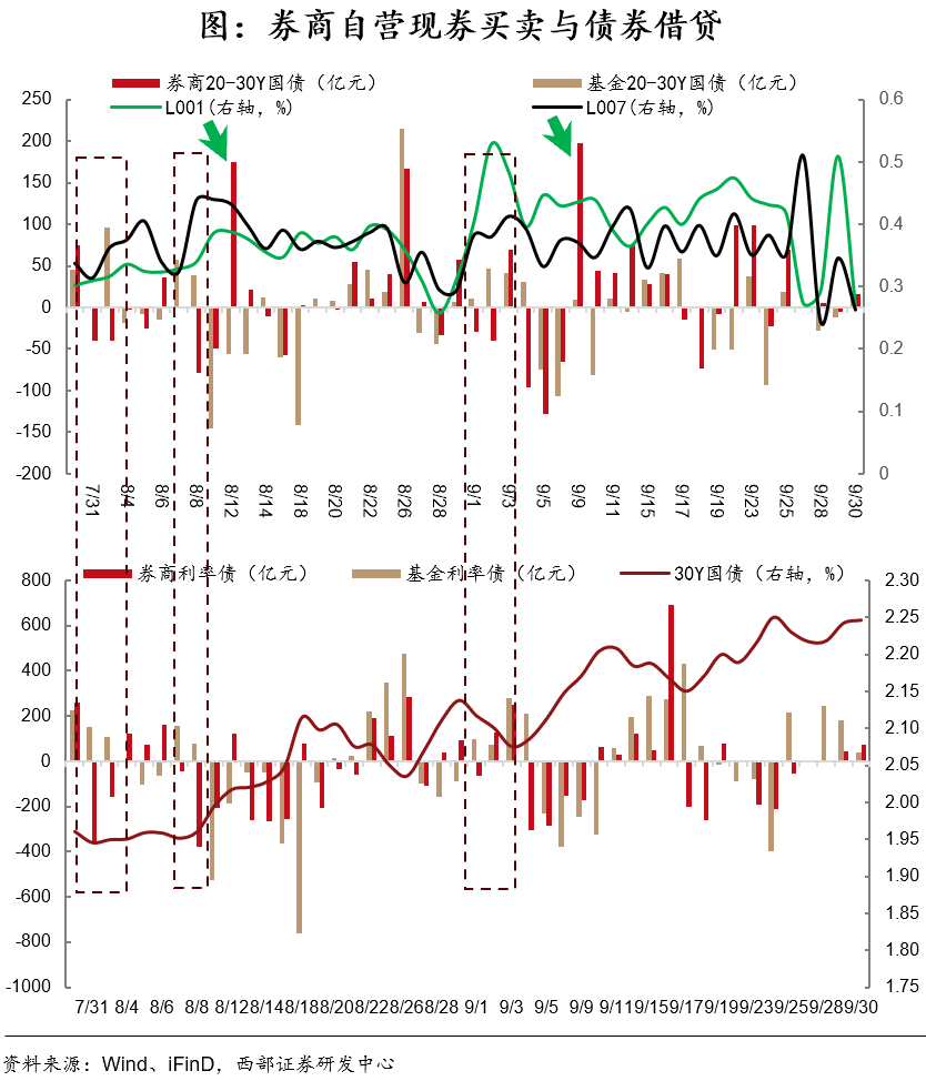 灵活运用债券借贷工具放大收益。8月以来券商往往与基金逆向进行波动操作,在逆向卖出时,往往通过借入债券放大收益(如8月初、8月8日、9月初券商卖债时借贷成本显著升高),随后等利率上行后在现券市场买入回补(如8月12日、9月9日借贷成本显著下降,同时大量买入30Y国债现券)。
