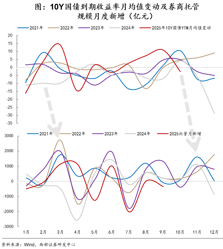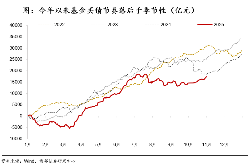 从整体数据看,今年以来基金买债规模落后于2022-2024同期水平;从债券托管数据看,7-9月广义基金债券托管量下降超4000亿元。