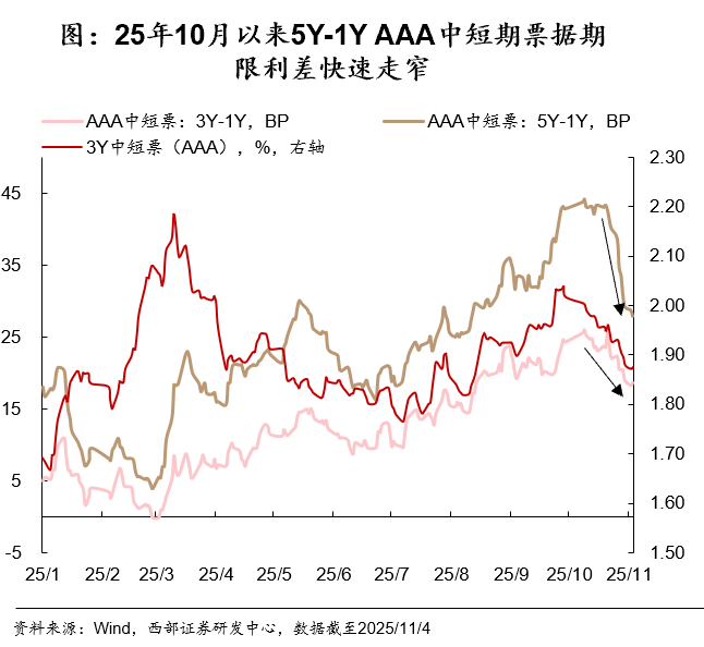 25年10月,封闭期为63M的基金集中到期,5Y-1Y的AAA中短票利差快速走窄,幅度明显大于3Y-1Y。