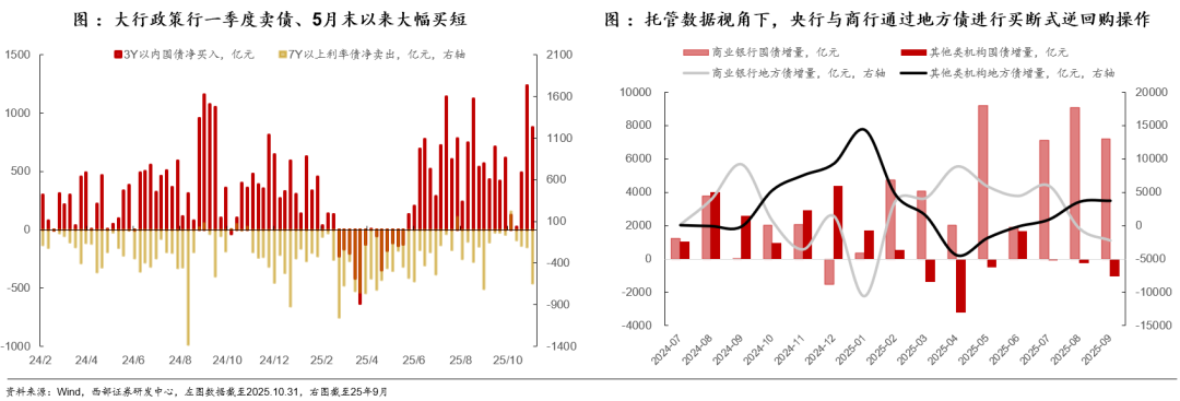 央行国债买卖对于大行二级市场买卖债券的影响:现券市场看,24年大行配合央行国债买卖、买短卖长;25年央行暂停国债买卖后大行转为卖出短债;5月以来持续买入短国债,同时继续卖出长利率债,一方面为央行重启国债买卖后作政策储备,另一方面出于投资组合的久期管理;托管数据看,24年8月至24年12月其他类机构国债增持量连续增加,在央行暂停国债买卖后增量下降并转为负增。