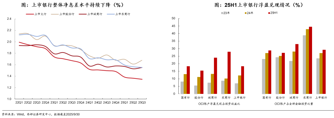 净息差持续收窄的压力下,银行OCI账户占全部金融投资比重明显上升,同时在25年较多通过OCI账户进行浮盈兑现。