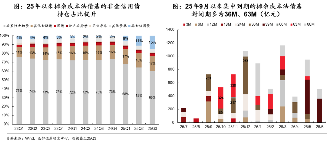 从到期结构来看,25年底至26年一季度将有大量规模到期并再次建仓,25年底的债基封闭期主要集中于3Y、5Y。